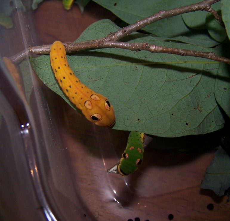 Notice the color changes, the peachy colored one is getting ready to pupate.